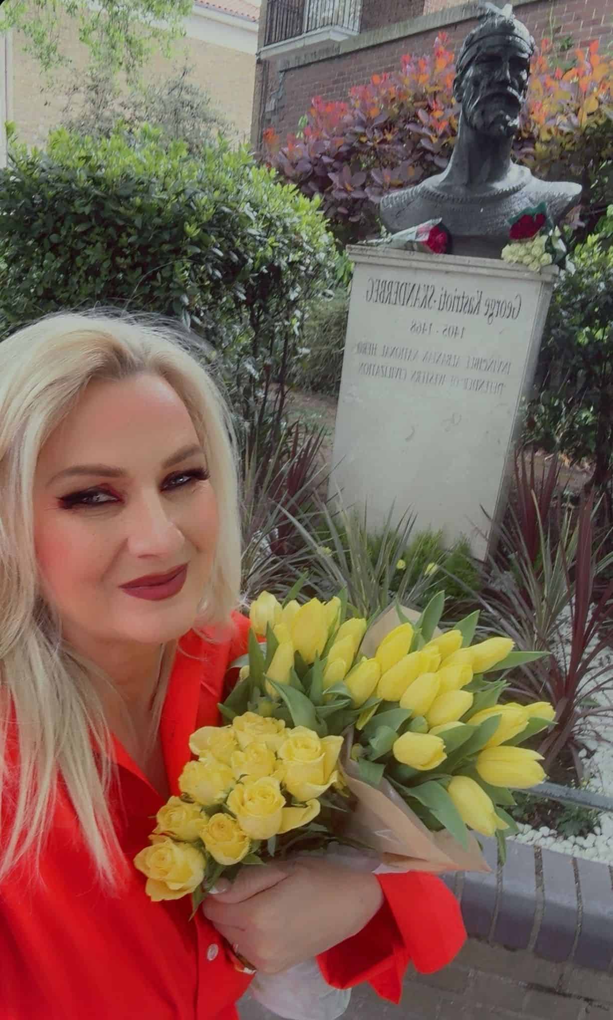 “Pas një postimi të Ambasadorit Mal Berisha, vendosa të veproj. Me fondet e mia, bleva lule dhe materiale dekorative, dhe me duart e mia i mbolla pranë bustit. Nuk mund të qëndroja indiferente ndaj figurës që na dhuroi dritë – siç ishte dhe ngjyra e luleve që zgjodha.”